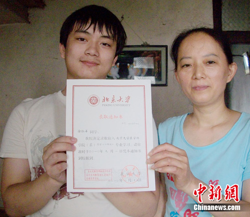 中新網(wǎng)重慶7月15日電 (連肖) 從徐仁洋接到北京大學(xué)的錄取通知書至今,母親楊治群已連續(xù)兩天晚上睡不著覺了。“我睡不著,一半是因?yàn)榕d奮,另一半則是惆悵!睏钪稳赫f,他們一家三口 “蝸居”在重慶一個(gè)月租200元的出租房里,固定經(jīng)濟(jì)來(lái)源是每月260元的低保費(fèi),家中連兒子去北京的路費(fèi)都拿不出來(lái),更別說高昂的學(xué)費(fèi)了。