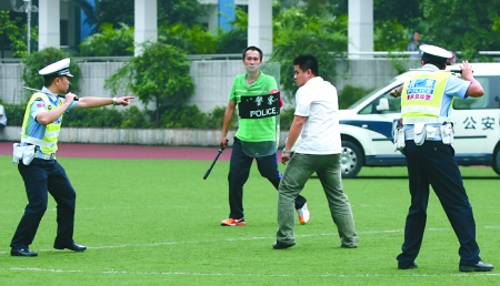 15時07分,一輛警車開進操場,8名全副武裝的飛龍突擊隊員跳下車門,迅速包圍操場中央圓弧。他們身穿多功能戰(zhàn)術背心,頭戴防彈頭盔,手握沖鋒槍,大腿外側還佩戴著手槍。“放下兇器”,一名突擊隊員通過擴音設備兩次喊話,但兩名持刀男子拒不就擒。