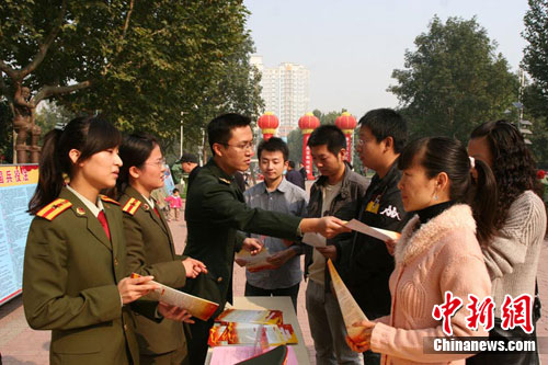 筆者現(xiàn)場看到,鄭州大學(xué)、華北水利水電學(xué)院、河南工業(yè)大學(xué)等高校門口人潮涌動。剛從武漢大學(xué)應(yīng)屆畢業(yè)的趙保國,因?qū)W有計算機科學(xué)與技術(shù)熱門專業(yè),前不久已經(jīng)被河南航天某電子有限公司聘用,月薪3000多元,受行伍出身的父親影響,中學(xué)時就向往綠色軍營的他,看到熱鬧的征兵宣傳現(xiàn)場更是熱血沸騰:“國防和軍隊現(xiàn)代化建設(shè)的新發(fā)展需要高學(xué)歷的優(yōu)秀青年青年到部隊建功立業(yè),地方再好的待遇也誘惑不了我,一定要報名參軍、獻身國防!