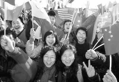 圖為北加州的中國留學(xué)生為奧運(yùn)圣火傳遞搖旗吶喊。