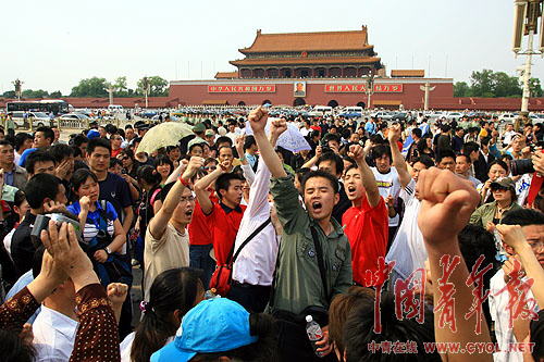 5月19日下午,天安門廣場上聚集了數(shù)萬名參與哀悼活動的群眾,在默哀完畢后,此起彼伏的“中國萬歲”、“中國加油”的聲音響徹云霄。幾名四川籍在京大學生用四川話激昂高呼“四川雄起”,在場的四川人奮起響應,很快,來自全國各地的人們都受到強烈的震動,一起吶喊起來,一聲聲感人肺腑的吶喊聲在天地間回蕩,一雙雙舉著國旗的手臂在廣場上有力的揮舞,廣場漾起了一片血色的愛國暖潮。