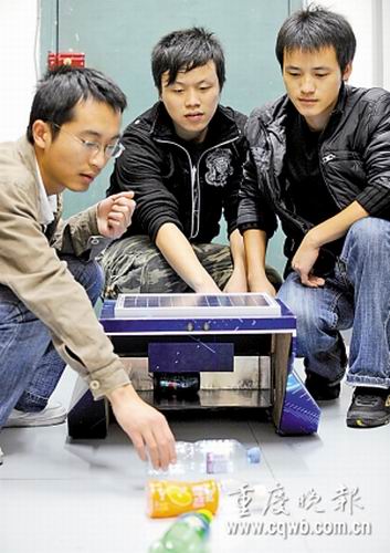 “我們發(fā)明的機(jī)器人會撿礦泉水瓶和塑料袋,還會掃地……我們將把它作為畢業(yè)紀(jì)念品送給學(xué)校。”昨日(10月29日),重慶交通大學(xué)機(jī)電與汽車工程學(xué)院的大四學(xué)生胡偉平、謝敬濤、王定坤等五位同學(xué)將發(fā)明的“保潔機(jī)器人”贈送學(xué)校,作為回報母校的禮物。