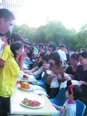 現(xiàn)場(chǎng)烹飪比賽結(jié)束后,各參賽隊(duì)伍把自己的成品展示在一排長(zhǎng)長(zhǎng)的桌子上,F(xiàn)場(chǎng)學(xué)生排起了數(shù)十米長(zhǎng)的隊(duì)伍,人手一只碗,一雙筷,擺好陣勢(shì)沖著美食長(zhǎng)龍開始了“掃蕩”!捌呃镲h香”雞翅,“盛世金蘭”南瓜煲......各位學(xué)生大廚一邊介紹一邊拉票,場(chǎng)面熱鬧非凡。 (記者 薛冰 實(shí)習(xí)生 林珍 通訊員 何淑賢)
