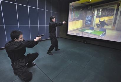 射擊訓(xùn)練中心的實戰(zhàn)模擬射擊室更有現(xiàn)場感。屏幕上,兩名持槍劫匪突然出現(xiàn)在某銀行營業(yè)部,接到報警后,警察將現(xiàn)場包圍,對峙談判無果后,歹徒舉槍射擊,面向屏幕的教官涂明焰和王強同時開槍,兩名歹徒應(yīng)聲倒地,任務(wù)成功!“這是無線電波覆蓋區(qū),訓(xùn)練者的任何動作都反映在屏幕內(nèi)!蓖棵餮娼榻B。據(jù)了解,控制中心有上千個不同犯罪模擬場景,同一現(xiàn)場中,歹徒可能持刀,可能持槍,也可能投降,現(xiàn)場民警必須根據(jù)具體情況,選擇是喊話勸降,是使用胡椒噴霧器、警棍,還是開槍射擊。