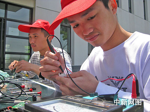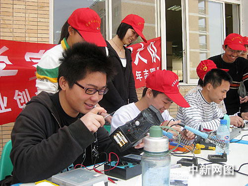圖為兩校大學(xué)生在利用所學(xué)專(zhuān)業(yè)知識(shí)免費(fèi)維修小家電。中新社發(fā) 屠建達(dá) 攝