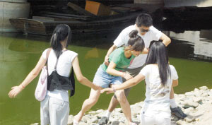 不少圍觀者接受采訪時表示,模擬“演戲”沒有必要非得“真刀實槍”。“其實他們這樣挺危險的,”一名中年婦女這樣說,“穿綠T恤的女孩都踩進水里了,要是她不小心摔倒,或者救她的人沒抱住她,搞不好她真的會落水!