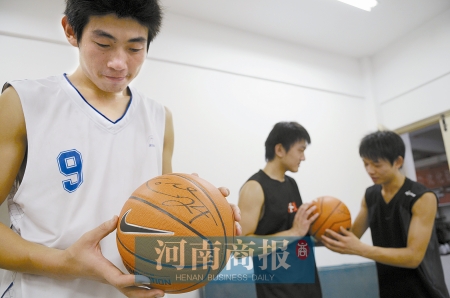 喝過(guò)茶,四個(gè)大男孩算是正式投入科比門(mén)下。隨后,他們送上事先準(zhǔn)備好的拜師禮:信陽(yáng)毛尖和一對(duì)中國(guó)結(jié),中國(guó)結(jié)上印有科比全家福照片。洋師傅大喜過(guò)望,回贈(zèng)了幾位“大弟子”簽名籃球和文化衫。如今這些已成了鄭大籃球隊(duì)的寶貝。