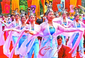 本報(bào)訊 (記者劉顯仁 通訊員田禾、楊靜) “珠村大祠堂,要擺大七娘。小女勤乞巧,男兒換靚裝……”昨天上午,用現(xiàn)代曲譜吟唱古詩(shī)《珠村七夕吟》聲中,2009廣州乞巧文化節(jié)在天河區(qū)珠村七夕文化廣場(chǎng)開(kāi)幕,共有近萬(wàn)名市民群眾觀看了開(kāi)幕式。
