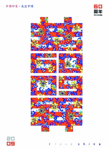 為迎接新中國(guó)60周年華誕,該校包裝系教授陳瞻最近特意設(shè)計(jì)了這一款海報(bào),其最大的特點(diǎn)遠(yuǎn)看是“囍”,近看又能凸顯出09和60兩個(gè)具體的主題,花紋和色彩設(shè)計(jì)烘托出喜慶氣氛。