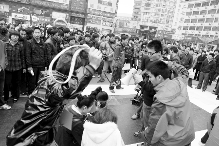 河南商報(bào)報(bào)道因發(fā)帖指責(zé)鄭州艾迪美文化傳媒有限公司(以下簡(jiǎn)稱(chēng)艾迪美公司)不退還押金,是個(gè)“騙子”,4月7日,發(fā)帖者稱(chēng)遭到了該公司人員皮帶抽、拳頭打的噩運(yùn)。昨天,發(fā)帖者和部分受害者在二七廣場(chǎng)聚會(huì),以“行為藝術(shù)”再現(xiàn)艾迪美公司打人的場(chǎng)景。