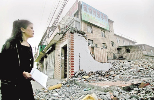 杭州彭埠鎮(zhèn)備塘路西邊是一大片廢墟,因?yàn)榛疖嚃|站樞紐工程建設(shè),這里大片房子都拆走了。廢墟中,卻有一幢四層樓孤零零地站著。很少有人知道,這是一所時(shí)裝學(xué)校,學(xué)校里至今還有100多人在上課。由于四周房子都拆走了,學(xué)校樓房墻壁上出現(xiàn)了裂縫,樓面也有些傾斜,玻璃窗也壞了。為什么學(xué)校遲遲不搬?接到讀者報(bào)料后,記者來(lái)到現(xiàn)場(chǎng)。