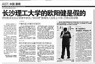 26日湖南某報(bào)的追蹤報(bào)道稱(chēng),25日晚上,華中科技大學(xué)的歐陽(yáng)健說(shuō),長(zhǎng)沙理工大學(xué)的“歐陽(yáng)健”家長(zhǎng)打來(lái)電話(huà),要求他們不要再繼續(xù)追查。
