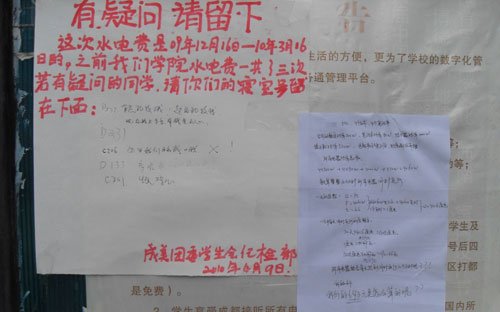 隨后,該校后勤部工作人員張貼了一份通知向?qū)W生解釋。通知寫道:“該表為學生公寓2009年9月~2010年3月學生公寓應交水電費;實際計量水、電月份分別為2009年10月、11月、12月,2010年1月、3月(1月10日~2月28日寒假)。”