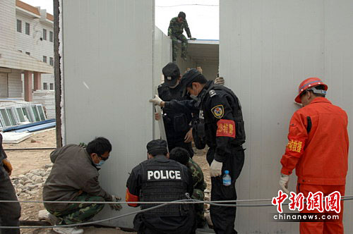 當(dāng)天下午,由成都公安特警30名青年民警組成的突擊隊與建材集團(tuán)員工一起先用挖土機(jī)將地面推平,然后隊員們分工合作、用帶來的發(fā)電機(jī)迅速發(fā)電,有的切割泡沫板,有的在鋼板上鉆孔,有的拼接泡沫墻面,在“5.12”抗震救災(zāi)時掌握的“施工技術(shù)”在這兒全用上了。這時的天空又一次飄起了雨夾雪,寒氣襲人,但特警隊員們?nèi)匀桓蓜攀。由于高原缺氧,一名隊員在劇烈搬送后出現(xiàn)了頭暈癥狀,其他隊員馬上將他扶到一旁休息,另一名隊員立即替補(bǔ)上去,他們就這樣輪番著作戰(zhàn)。在拼接板墻的時候,由于風(fēng)沙很大,隊員們眼睛、嘴里全是沙,但他們顧不了那么多,心中只有一個信念:就是以最快速度將板房建好,讓災(zāi)區(qū)的同學(xué)們早日復(fù)課,參加學(xué)習(xí)。