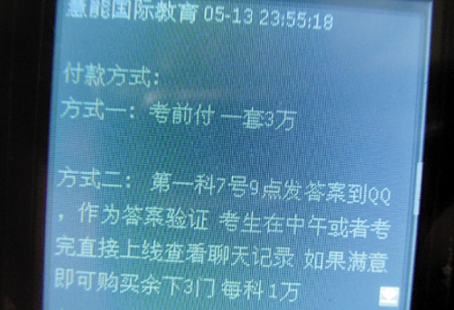 稍早前,徐杰在一個頗有人氣的高考吧里發(fā)帖時被賣“高考答案”的人盯上了,這個叫“慧能國際教育”的QQ號,其簽名檔寫著:“高考考前答案已發(fā)出,請各位客戶收到后立即回復(fù)索取解鎖密碼!”徐杰說,對方開門見山告訴他,能搞到今年高考試題答案,而且是第一手的。為了讓徐杰相信,賣家稱第一科可在7日上午9時發(fā)答案到其QQ上,作為答案驗證,考生在中午或考完直接上線查看聊天記錄,如果滿意,可購買余下幾門考題和答案,每門1萬元。如果考生在考前付錢,全套3萬元,考題和答案會在考前一天下午2時準時發(fā)到其郵箱(見右圖)。賣家還聲稱,考卷是掃描版的,答案是特級教師和高級教授做出的,準確率在95%以上。按照賣家的說法,只要花重金,考生“包二本以上力爭一本”,就可讀上理想中的大學(xué)。