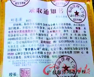 記者發(fā)現(xiàn),這些發(fā)出錄取通知書的學(xué)校,全部都提出各種各樣令人心動的優(yōu)惠條件。像某學(xué)校的錄取通知書上就寫著“零學(xué)費(fèi)入讀”以及“享受用人單位補(bǔ)助的各種優(yōu)惠政策”。明眼人一看,就知道這些錄取通知書很可疑。