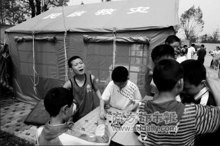 死者長已矣,活著的還要繼續(xù)生活,學(xué)生們在臨時搭建的帳篷教室外下棋玩耍。