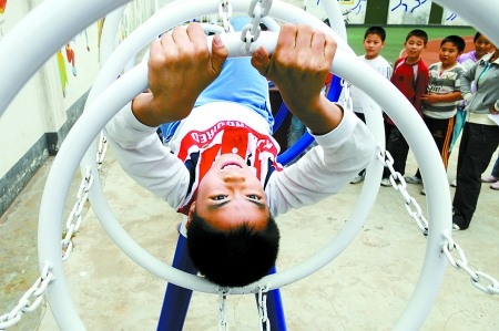 五年級(jí)的小學(xué)生徐成林排隊(duì)坐在一個(gè)名叫“過山環(huán)梯”的器材上,面朝上躺下,然后憑著手和腳的力量在環(huán)形的器材里,像只小蟲一樣蠕動(dòng)前進(jìn)。