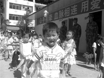 5·12地震時(shí),龍門(mén)山鎮(zhèn)幼兒園100多名孩子正在幼兒園午睡,5名老師冒著生命危險(xiǎn)將他們?nèi)繐屃顺鰜?lái),但校舍卻成了危房。“再苦不能苦孩子!”在龍門(mén)山鎮(zhèn)參加救援的廣州空軍官兵知道后,立即著手為孩子們重建樂(lè)園。