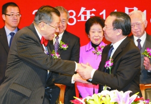 儀式開始,介紹到“北大校長周其鳳院士”時,周其鳳兩次起身抱拳,向?qū)λ硎練g迎的北大學(xué)生致謝。周其鳳與葉謀遵共同簽署了捐贈協(xié)議,并向其頒贈了感謝證書。