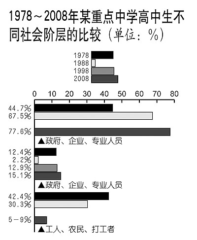 通過簡單的數(shù)學(xué)運算,我們可以看到,來自私營企業(yè)主家庭的學(xué)生在重點高中生中所占比例為11.79%,明顯高于他們在社會總體(0.54%)中所占的比例,高出了11.25個百分點,個體工商戶的所占比例也高出了9.57%,經(jīng)理人員階層的所占比例高出了9.13%。