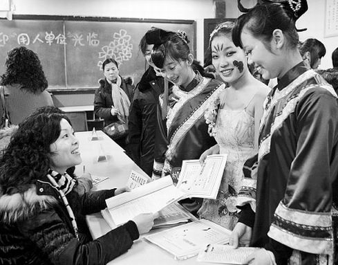 “今年學(xué)生們的總體期望值下降了,以前像寧夏、新疆這些地方要招人,根本沒人愿意去,特別是成績優(yōu)秀的學(xué)生,工資少于4000根本不考慮,但今年,很多學(xué)生自己降低了要求!痹陉兾鲙煼洞髮W(xué)就業(yè)指導(dǎo)中心辦公室采訪時,記者遇到了該校外國語學(xué)院老師。