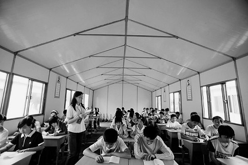 昨天一大早,14歲的王柱良背著書包重新回到了崇州何家中學的課堂。與其他重災區(qū)的受損學校不同,這所抗震中學用的不是帳篷,而是花了一天時間搭建起來的彩鋼復合夾心板房子。