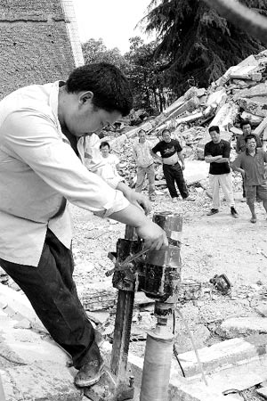 家長們很不理解,大聲質(zhì)問:“為什么不透露單位名稱?我們怎樣得到檢測結果?”“我們是四川禾力建設工程質(zhì)量檢測有限公司的!惫ぷ魅藛T忙說。該公司另一組取樣人員,正在對綿竹市幾所學校的建筑廢墟進行取樣。隨著機器的轉動,一個個標本從大梁中取出,他們在樣本上標注上日期和地址等信息。