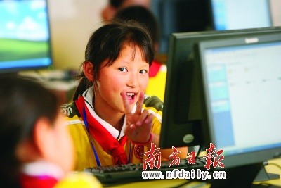 一名學(xué)生在上電腦課時,調(diào)皮地沖著記者做手勢。