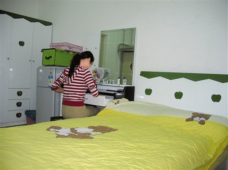 10平方米的屋子擺放著一張雕花大床、全套粉紅色電腦桌、梳妝臺和衣柜,空調(diào)、冰箱和電飯煲等生活家電齊備,墻壁上花狀壁燈和各式各樣裝飾品仿佛透露了這間房的“主人家”是個年齡不大的姑娘……如果不是從四川某高校女生宿舍樓大門進(jìn)來,記者都不敢確定應(yīng)該用“學(xué)生宿舍”還是“賓館套房”為這間屋子定名。