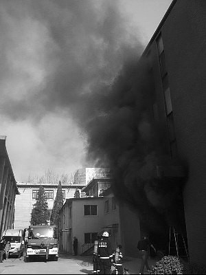消防員趕到時(shí),濃煙從大門口翻滾而出。昨日,北航一實(shí)驗(yàn)室失火。通訊員 田佳偉 攝
