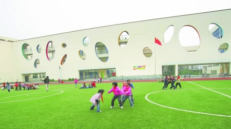 昨日下午,記者來到草堂小學(xué)翠微校區(qū),4棟通過走廊連為一體的4~5層的建筑格外引人注目。正對學(xué)校大門的墻體,鑲著10多個(gè)彩色的橢圓。設(shè)計(jì)者、西南交通大學(xué)教授王蔚介紹說,翠微校區(qū)占地20余畝,建筑面積一萬余平方米,而總投資僅 2000多萬元!斑@些彩色的橢圓圖案,代表著水滴。陽光下,‘水滴’呈現(xiàn)出不同顏色,這代表了學(xué)生們的不同個(gè)性。校舍以‘陽光下的水滴’為設(shè)計(jì)構(gòu)思,充分表達(dá)了在我國素質(zhì)教育的原則下,尊重個(gè)性發(fā)展,尊重少年兒童人格特征的理念!
