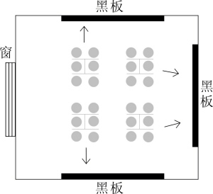他們的教室不一般。課桌不再是傳統的“秧田式”,而是排成“工”字形擺放。一個“工”由6張課桌組成,一個教室大約有8組!斑@樣就構成了擁擠卻不乏溫馨的小組型學習園地,很多課堂教學任務需要一個小組去完成,在這個過程中可以培養(yǎng)學生的合作能力、自主學習能力。”劉書記指指教室四周,原來白墻的地方都安置了黑板,也就是說,一個教室至少有三面黑板!八械暮诎逵媚z帶紙分隔成40厘米左右寬度的小塊,供小組內學生板演、展示之用。數學習題、英文單詞、語文生字、古詩……內容隨課程的交替而常換常新!