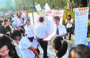 記者看到,不少置業(yè)顧問為了在場外截留客戶,干脆在場外擺下戰(zhàn)場。他們有的將房源做成小的展板,舉在頭上,有的將房源寫成大字報擺地上,在會展中心場外形成了一個場外房交會。