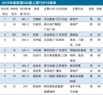 上周末,《新財富》雜志發(fā)布2010年“新財富500富人榜”,上榜富人財富總額為28756.5億元,較2009年增長76.6%。萬達(dá)集團王健林以401.1億元位居首富;許家印以385.3億元位列第二;張茵以344.2億元位列第三。