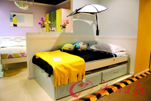 記者看到很多類似組合:高架床,床旁邊是一個小扶梯,扶梯臺階由幾個抽屜拼成,抽屜可以儲放衣物。床下面是一個轉(zhuǎn)角電腦學(xué)習(xí)桌,可以放置一臺電腦,又可以當書桌使用。在電腦桌旁還放有一個小衣柜,可以放置一些常用衣物。另一轉(zhuǎn)角處有一個文件柜,可以放學(xué)習(xí)資料和書籍。電腦桌被分隔成二層,底下的一層還可以放小物件、書籍等。大約兩平方米的空間就這樣被充分利用起來了。