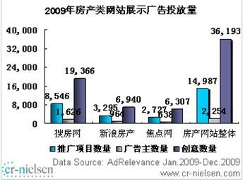 尼爾森《2009中國房地產(chǎn)網(wǎng)絡(luò)廣告市場研究項目報告》顯示,2009年中國互聯(lián)網(wǎng)房地產(chǎn)行業(yè)展示類廣告推廣項目總量為14987,廣告主總量為2254,創(chuàng)意總量為36193,三項指標(biāo)中搜房網(wǎng)分別占據(jù)了行業(yè)整體的57%、72%、53.5%。報告分析指出,房地產(chǎn)網(wǎng)絡(luò)展示廣告投放TOP3網(wǎng)站分別為搜房網(wǎng)、新浪房產(chǎn)和焦點網(wǎng),除搜房網(wǎng)以較大優(yōu)勢領(lǐng)先外,新浪房產(chǎn)與焦點網(wǎng)的展示廣告投放水平競爭膠著,新浪房產(chǎn)覆蓋房產(chǎn)行業(yè)42.8%的廣告主,焦點網(wǎng)約占三成,兩家網(wǎng)站房地產(chǎn)展示推廣項目數(shù)與創(chuàng)意數(shù)水平基本相當(dāng)。
