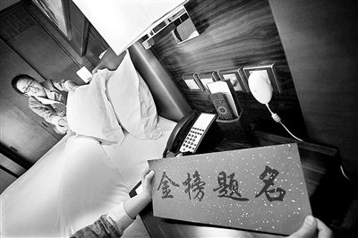 圖片來(lái)源:法制晚報(bào) 圖為酒店工作人員正在擺放“金榜題名”的卡片