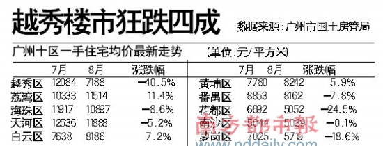 廣州越秀區(qū)房價大跳水,一手住宅均價從今年7月的12084元/平方米猛跌至7188元/平方米。廣州市國土房管局調(diào)查指出,越秀區(qū)房價大幅下降是由兩個低價樓盤的集中交易造成的,專家稱可能涉及內(nèi)部交易。而廣州市日前公布的最新房地產(chǎn)市場分析報告顯示,廣州全市十區(qū)8月一手住宅均價小幅下降至9078元/平方米。