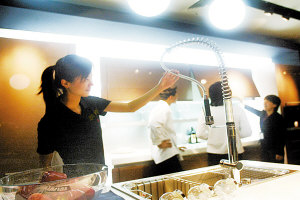廚房里的布局是按照食品的貯存和準(zhǔn)備、清洗和烹調(diào)這一操作過程安排的,應(yīng)沿著三項(xiàng)主要設(shè)備即爐灶、冰箱和洗滌池組成一個(gè)三角形,安置最合宜的距離以省時(shí)省力。據(jù)專業(yè)人士介紹,這三邊之和應(yīng)以0.45-0.67米為宜,過長(zhǎng)和過小都會(huì)影響操作。在操作時(shí),洗滌槽和爐灶間的往復(fù)最頻繁,因此廚房專家建議應(yīng)把這一距離調(diào)整到1-2米之間較為合理,讓使用者在拿取與放置食品時(shí)不會(huì)太近或太遠(yuǎn),在轉(zhuǎn)身時(shí)也不會(huì)顯得局促。需要注意的是,放置冰箱的位置不宜靠近灶臺(tái),因?yàn)楹笳呓?jīng)常會(huì)產(chǎn)生熱量,而且又是污染源,這將影響冰箱內(nèi)的溫度。同時(shí),冰箱也不宜太接近洗菜池,避免濺出的水導(dǎo)致冰箱漏電。