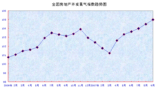 中新網(wǎng)10月26日電 國(guó)家統(tǒng)計(jì)局網(wǎng)站今日公布的數(shù)據(jù)顯示,9月份,“國(guó)房景氣指數(shù)”為104.99,比8月份上升0.51點(diǎn),同比上升1.85點(diǎn)。