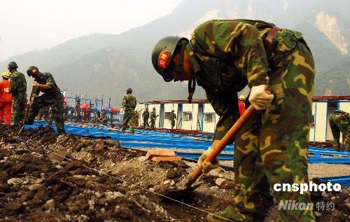 六月三日,空降兵士兵在四川什邡為受災(zāi)群眾建造臨時板房。這支空降兵部隊是一支有輝煌戰(zhàn)史的英雄部隊,在五月十二日大地震發(fā)生后八小時即空降至當(dāng)?shù)。目前抗震救?zāi)工作已進(jìn)入重建家園階段,他們共幫助受災(zāi)民眾建設(shè)六千多平方米的板房,搭建帳篷四千多頂,同時幫助恢復(fù)生產(chǎn)。中新社發(fā) 慎重 攝