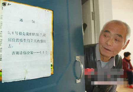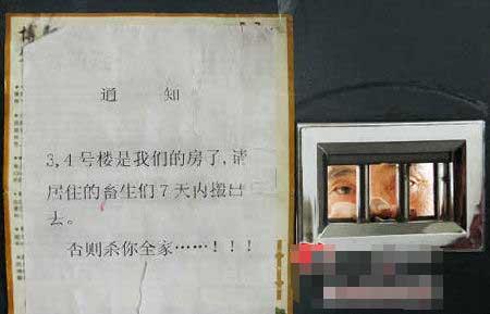該小區(qū)物業(yè)辦工作人員說,十天前,小區(qū)里突然出現(xiàn)了十幾張通知,落款未寫單位,但內(nèi)容很恐怖:如果三、四號樓的住戶不搬家,就殺他全家!罢麄小區(qū)的人都人心惶惶的,特別是三、四號樓的200多個住戶,日夜守在家里,生怕沒人的時候房子被人強占!痹摴ぷ魅藛T說。