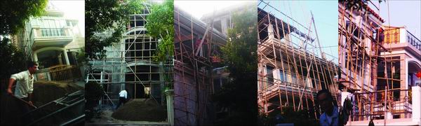 來到小區(qū)內(nèi)雅濤二街,一座原兩層半的別墅四周全是腳手架,樓下堆滿水泥沙石。不斷有泥頭車轟隆轟隆地開過來,將一堆水泥傾倒地上,空氣中滿是灰塵。房屋的大門已經(jīng)撤下,幾個滿頭大汗的工人站在腳手架上忙碌,幾個月的工夫,他們將房屋砌到了5層樓高。