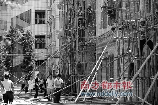 昨日中午11時(shí)30分,記者再次到達(dá)現(xiàn)場(chǎng),秀新(即埔廈新村)1巷、2巷、3巷、4巷、5巷等地,還有數(shù)棟樓房外搭有腳手架,木板、鋼筋散落一邊。橫崗街道執(zhí)法隊(duì)正在拆除一棟樓房的腳手架。龍崗區(qū)城市管理局副局長(zhǎng)兼查違辦主任何永華在一旁督戰(zhàn)。