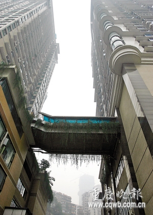 連接兩棟樓的天橋因“柏林墻”而失去存在的價(jià)值 記者 張質(zhì) 攝 圖片來(lái)源:重慶晚報(bào)