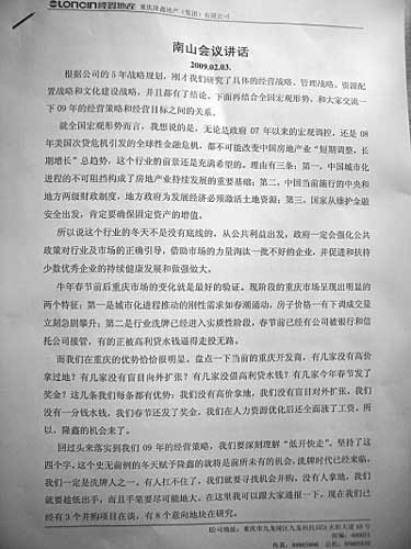 昨日,重慶一網(wǎng)友自稱貼出隆鑫地產(chǎn)一份高層內部南山會議講話稿的照片,其稱在春節(jié)后,隆鑫地產(chǎn)欲對旗下樓盤降價,以期快速回籠資金去買地擴張規(guī)模。從內容上看,講話者像是為隆鑫降價做動員工作,表明降價的目的是快速回籠資金并擴大規(guī)模。網(wǎng)友在跟帖中稱,萬科松山湖會議紀要事件驚現(xiàn)重慶版,隆鑫降價講話遭網(wǎng)絡泄密。隆鑫地產(chǎn)一位不愿意透露姓名的高層告訴記者,內部正在追查泄密者。
