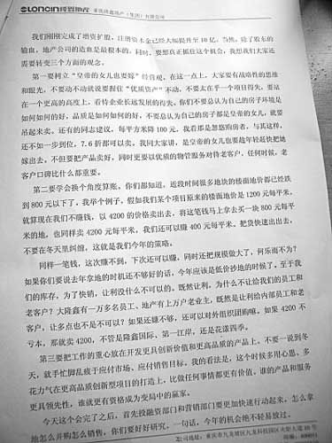 隆鑫地產(chǎn)一位不愿意透露姓名的高層領導向記者透露,其實這份講話稿是刪減后版本,這份整理后的講話內容,主要是給隆鑫地產(chǎn)公司的經(jīng)理以上、副總經(jīng)理級別以下的人學習并領會精神,而只有幾個核心層領導參與的內部會議,完整版里面降價的方案多達7種。