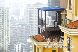 昨天中午,記者在該小區(qū)看到,“最牛吊腳樓”所在的5棟樓下拉著警戒線,幾個業(yè)主仰頭張望,說:“拆了我們就放心了!痹32樓該業(yè)主屋內(nèi),五六個工人正忙著鋸木頭柱子,藍(lán)色棚頂已拆除,雕花鐵藝欄桿和木頭桌椅也已移走,F(xiàn)場工人告訴記者,他們的拆除工作是從前天下午開始的。由于“吊腳樓”面積近20平方米,木頭柱子還用水泥焊住,“拆起來比修起來還麻煩!