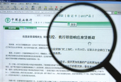 昨天下午,農(nóng)行成為本輪新政出臺(tái)后首家發(fā)布房貸細(xì)則的銀行,但在當(dāng)天晚上,農(nóng)行市場部卻通知記者:“該細(xì)則有些細(xì)節(jié)還要改動(dòng),監(jiān)管部門已將掛在農(nóng)行首頁上的相關(guān)文章撤下!庇浾唠S后打電話咨詢銀監(jiān)會(huì)相關(guān)負(fù)責(zé)人,該負(fù)責(zé)人表示沒有下達(dá)過指令,不清楚是什么情況。有業(yè)內(nèi)人士坦言,新政策“很難把握”,還得再看看。